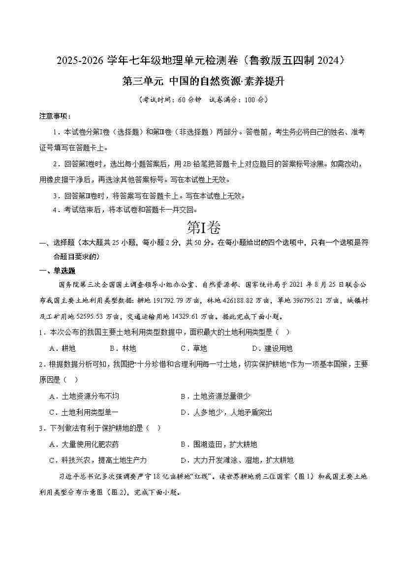 首页 > 全部 > 单元提升卷 > 七上地理第三章测试·提升卷(考试版A4)