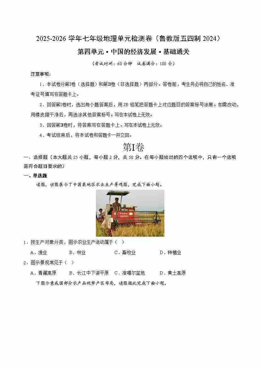 首页 > 全部 > 单元提升卷 > 七上地理第四章测试·基础卷(考试版A4)