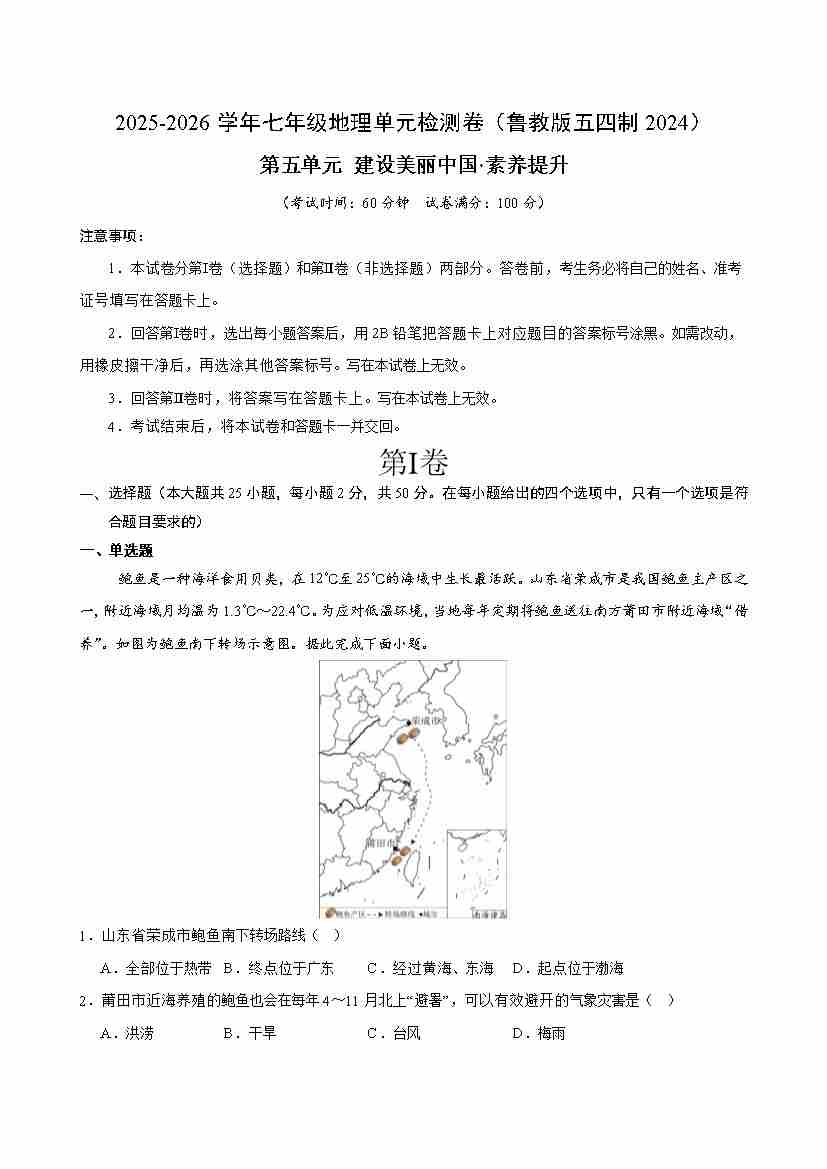 首页 > 全部 > 单元提升卷 > 七上地理第五章测试·提升卷(考试版A4)