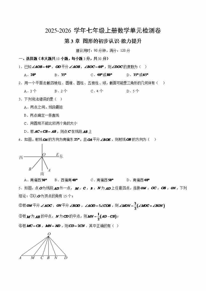 七上数学第3章 图形的初步认识测试·提升卷(考试版A4)