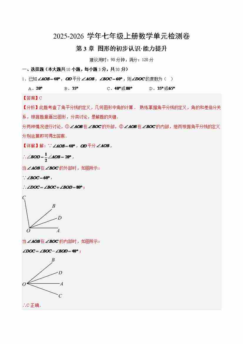 七上数学第3章 图形的初步认识测试·提升卷(教师版)