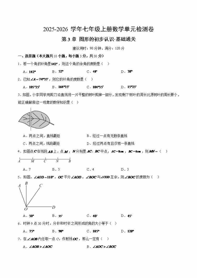 七上数学第3章 图形的初步认识测试·基础卷(考试版A4)
