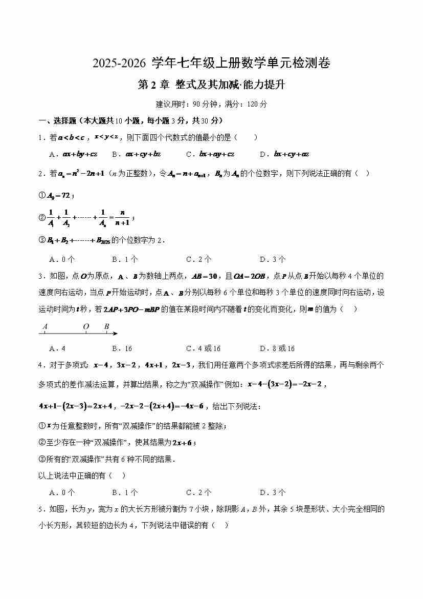 七上数学第2章 整式及其加减测试·提升卷(考试版A4)