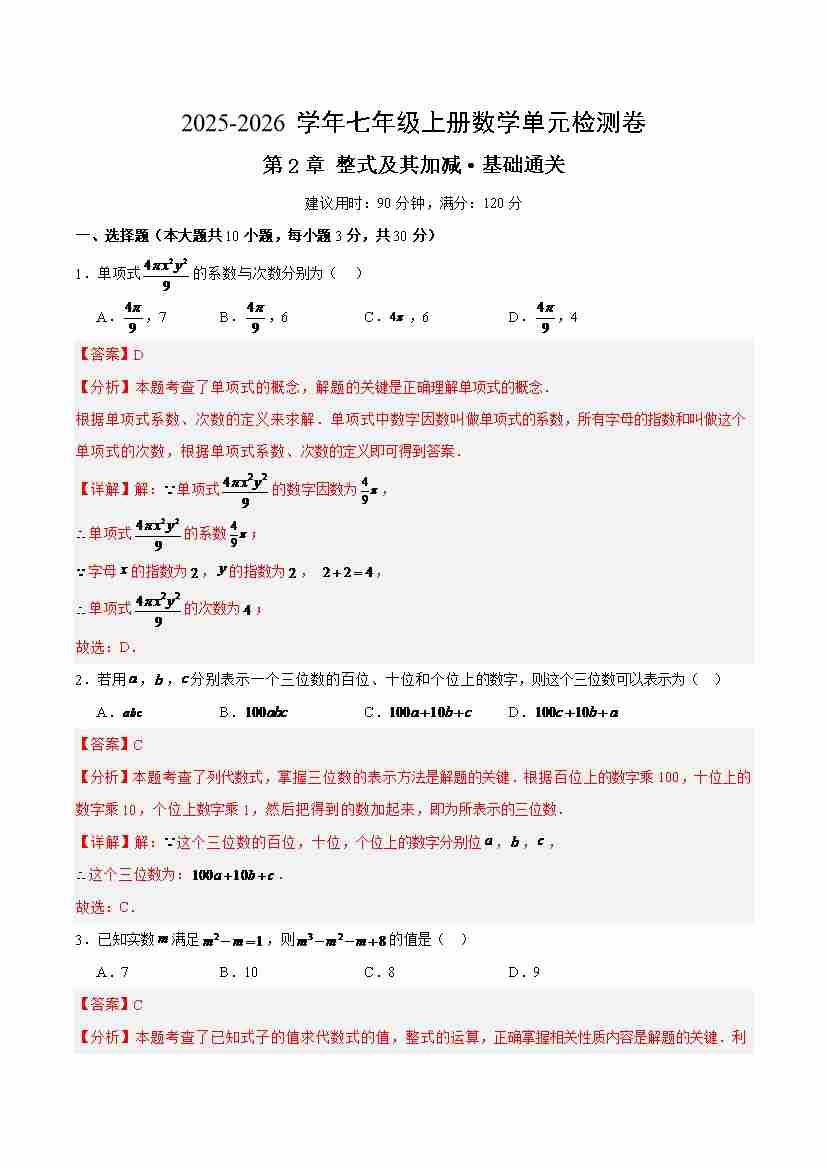 首页 > 全部 > 单元测试 > 七上数学第2章 整式及其加减测试·基础卷(教师版)