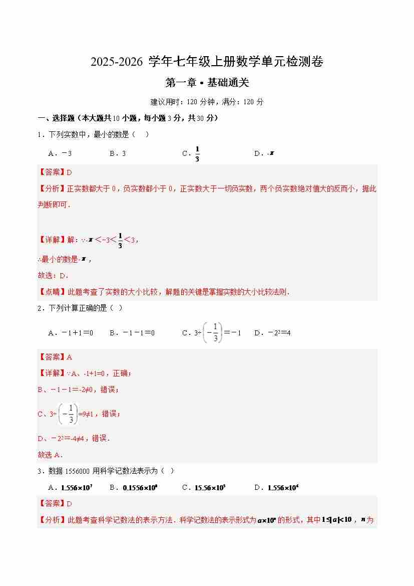 首页 > 全部 > 单元测试 > 七上数学第1章测试·基础卷(教师版)