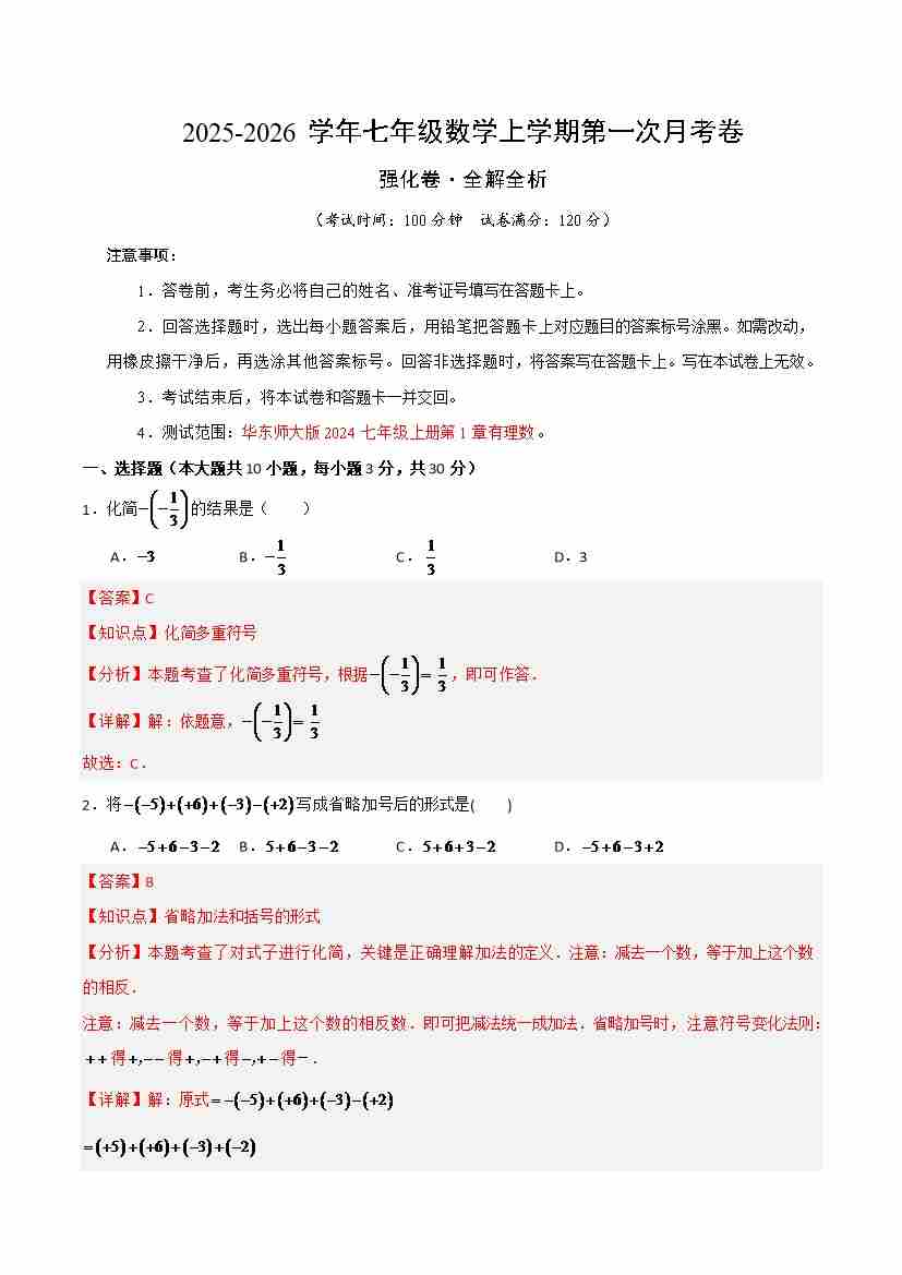 首页 > 全部 > 第一次月考 > 七年级数学上学期第一次月考( 高效培优·强化卷)(教师版)