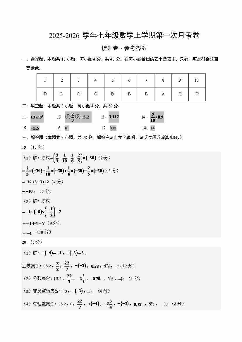 七年级数学上学期第一次月考(高效培优·提升卷)(参考答案)