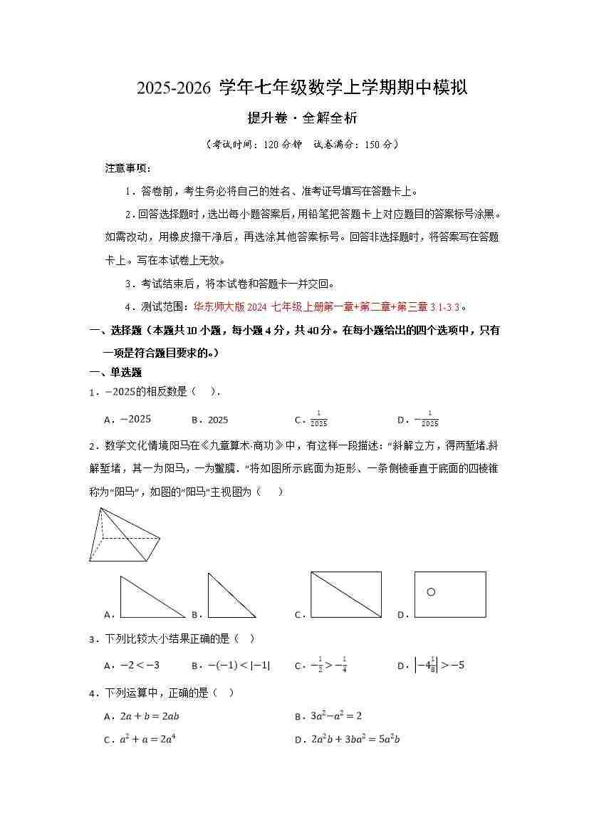 首页 > 全部 > 期中试卷 > 七年级数学上学期期中模拟(华东师大版2024,高效培优·提升卷)(考试版)