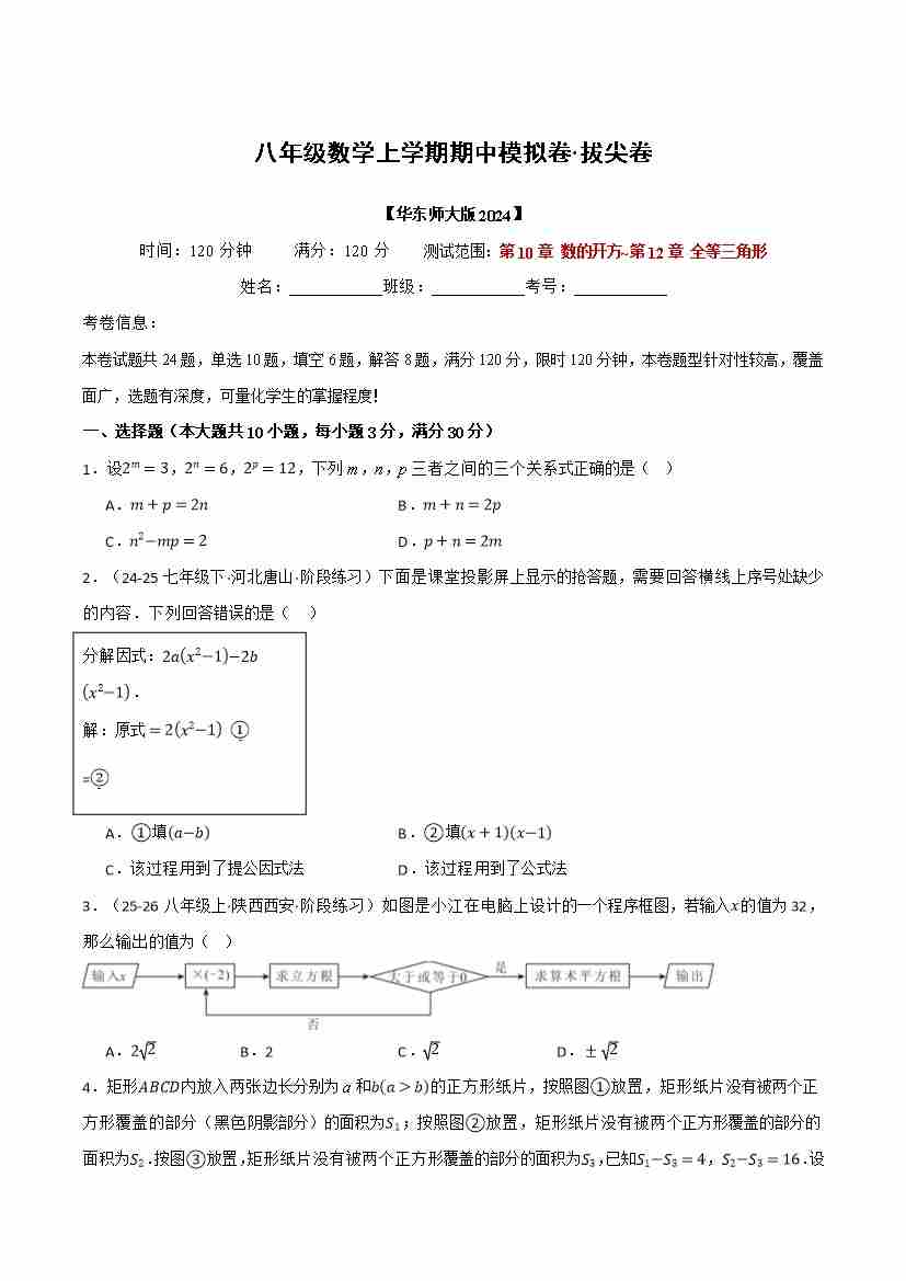 八年级数学上学期期中模拟卷·拔尖卷(华东师大版2024,举一反三)(学生版)
