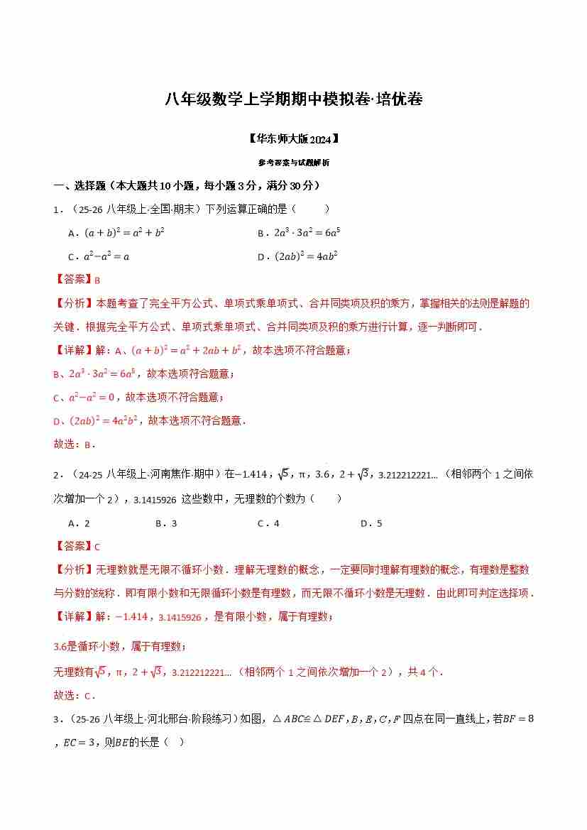 首页 > 全部 > 期中试卷 > 八年级数学上学期期中模拟卷·培优卷(华东师大版2024,举一反三)(教师版)