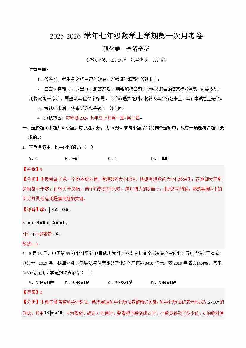 七年级数学上学期第一次月考( 高效培优·强化卷)(全解全析)