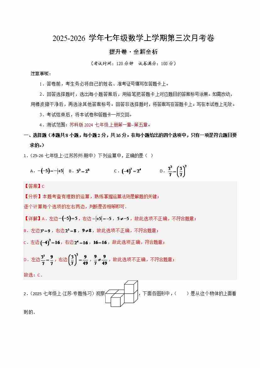 首页 > 全部 > 第三次月考 > 七年级数学上学期第三次月考(苏科版2024,高效培优·提升卷)(全解全析)