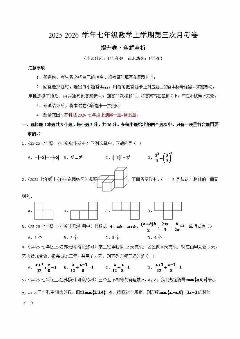 七年级数学上学期第三次月考(苏科版2024第1~5章,高效培优·提升卷)(考试版A4)