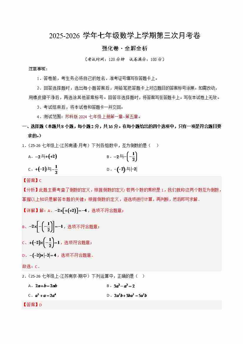 首页 > 全部 > 第三次月考 > 七年级数学上学期第三次月考(苏科版2024,高效培优·强化卷)(全解全析)