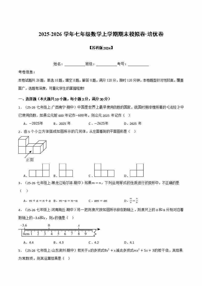 七年级数学上学期期末模拟卷·培优卷(苏科版2024,举一反三)(原卷版)