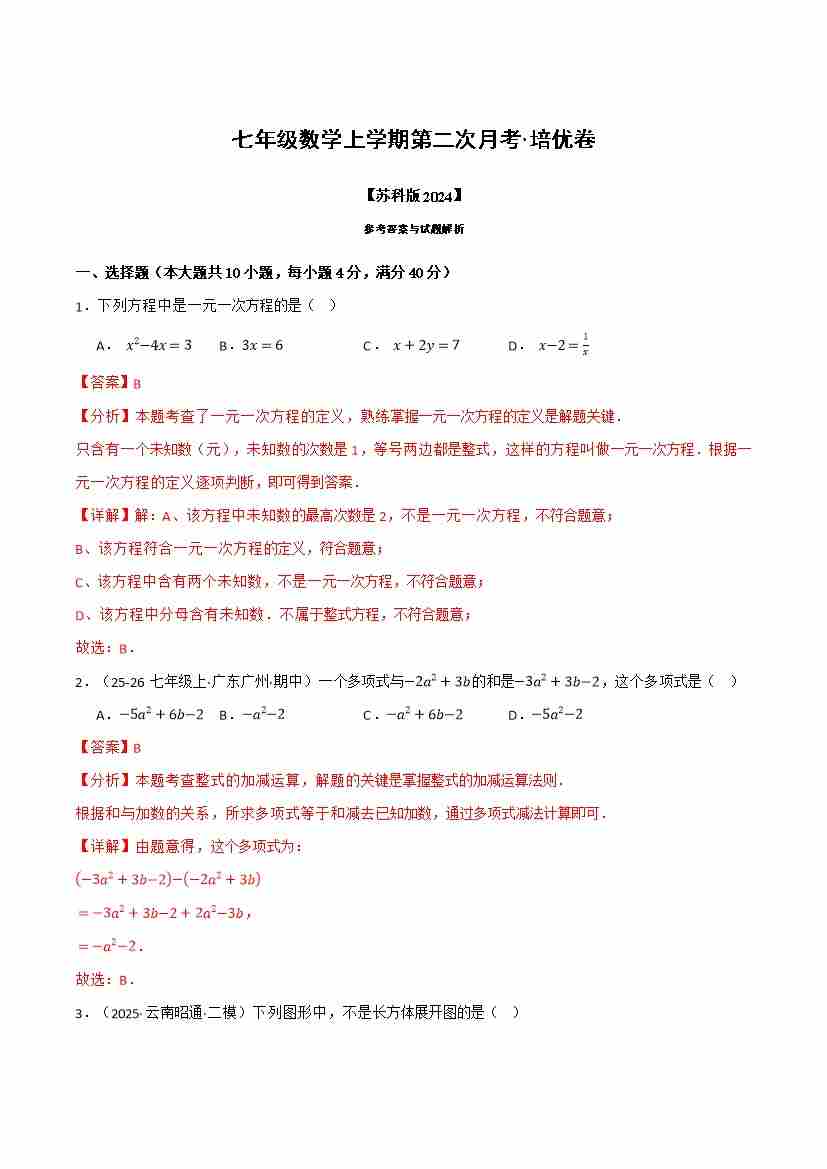首页 > 全部 > 第三次月考 > 七年级数学上学期第二次月考·培优卷(苏科版2024,举一反三,测试范围:第1章 数学与我们同行~第5章 走进几何世界)(教师版)