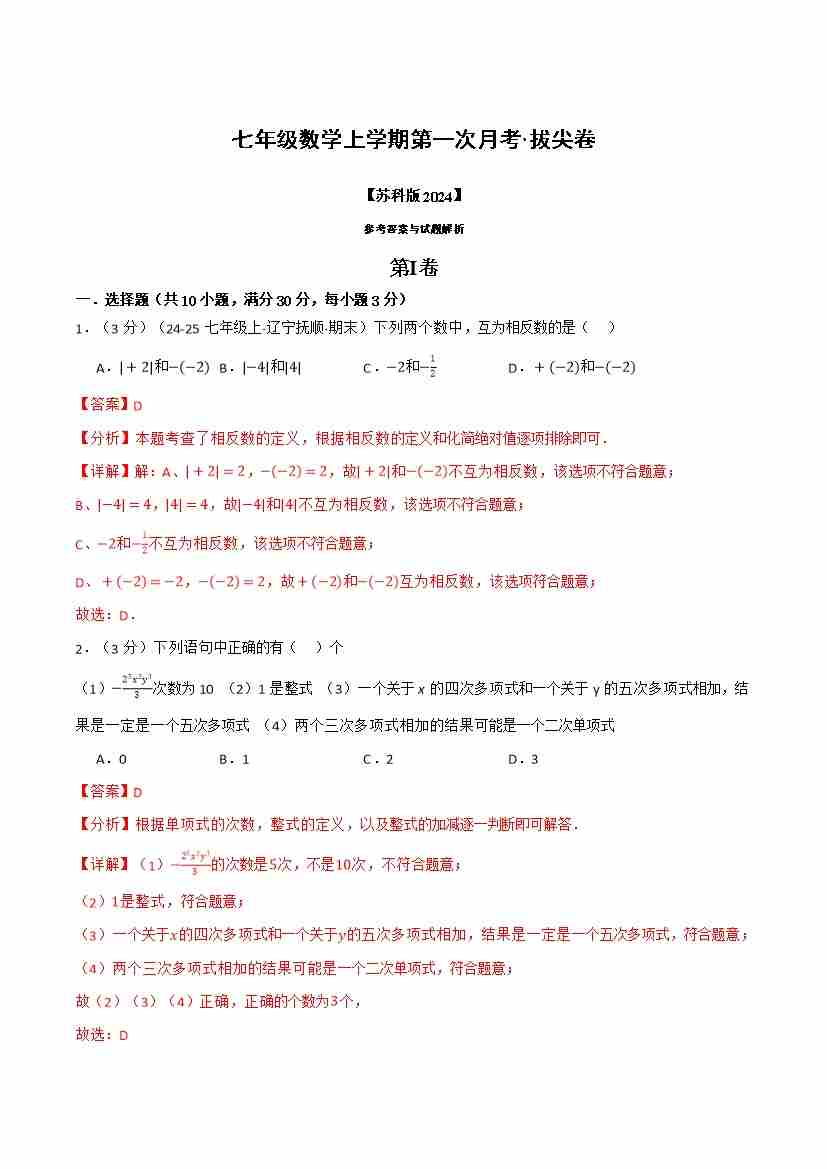首页 > 全部 > 第一次月考 > 七年级数学上学期第一次月考·拔尖卷(苏科版2024,举一反三)(教师版)