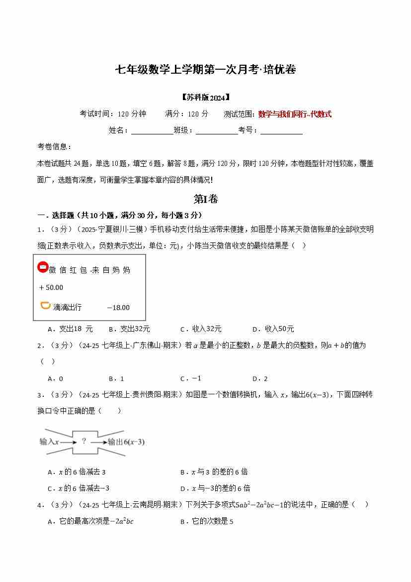 首页 > 全部 > 第一次月考 > 七年级数学上学期第一次月考·培优卷(苏科版2024,举一反三)(学生版)