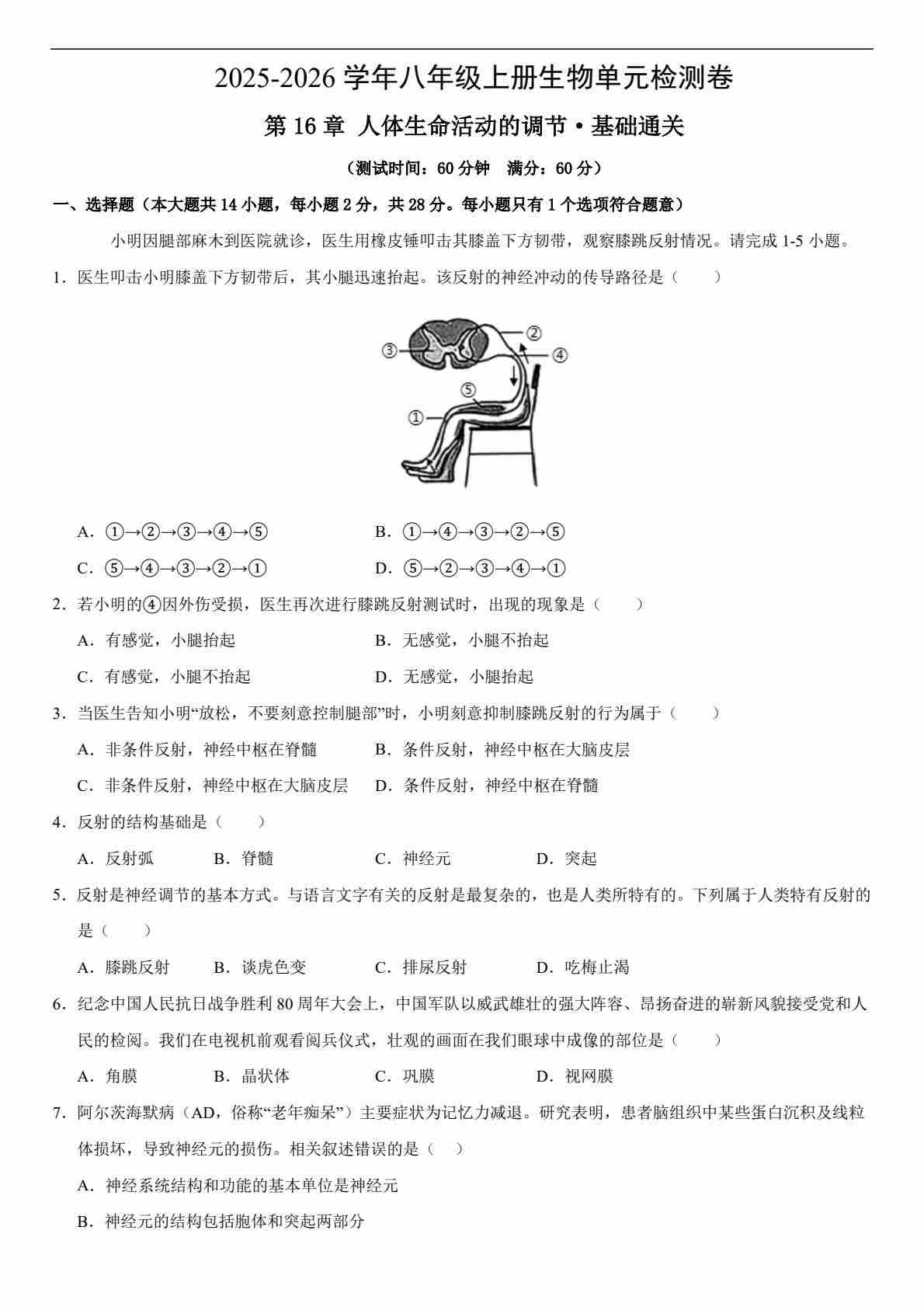 首页 > 全部 > 单元基础卷 > 第16章 人体生命活动的调节(单元测试·基础卷)(考试版A4)99
