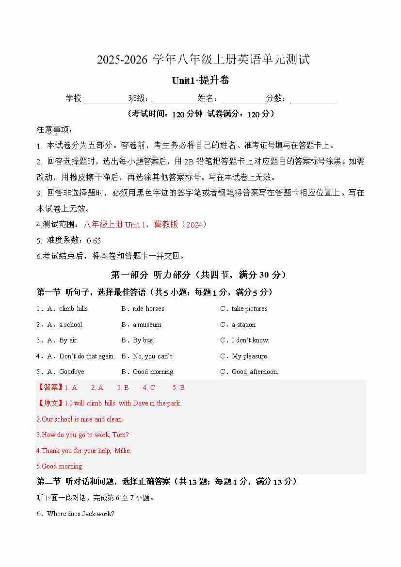 首页 > 全部 > 单元测试卷 > 八年级英语上册Unit1单元测试·提升卷(解析版)
