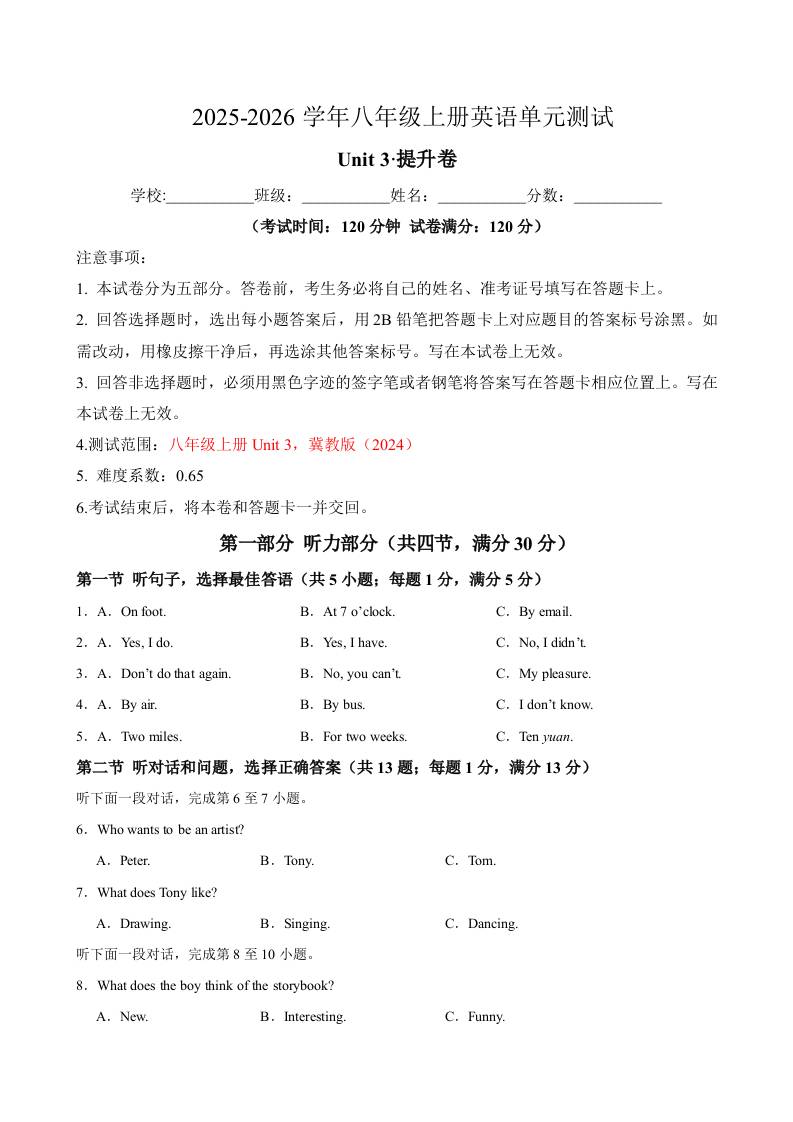 首页 > 全部 > 单元测试卷 > 八年级英语上册Unit3单元测试·提升卷(考试版A4)8