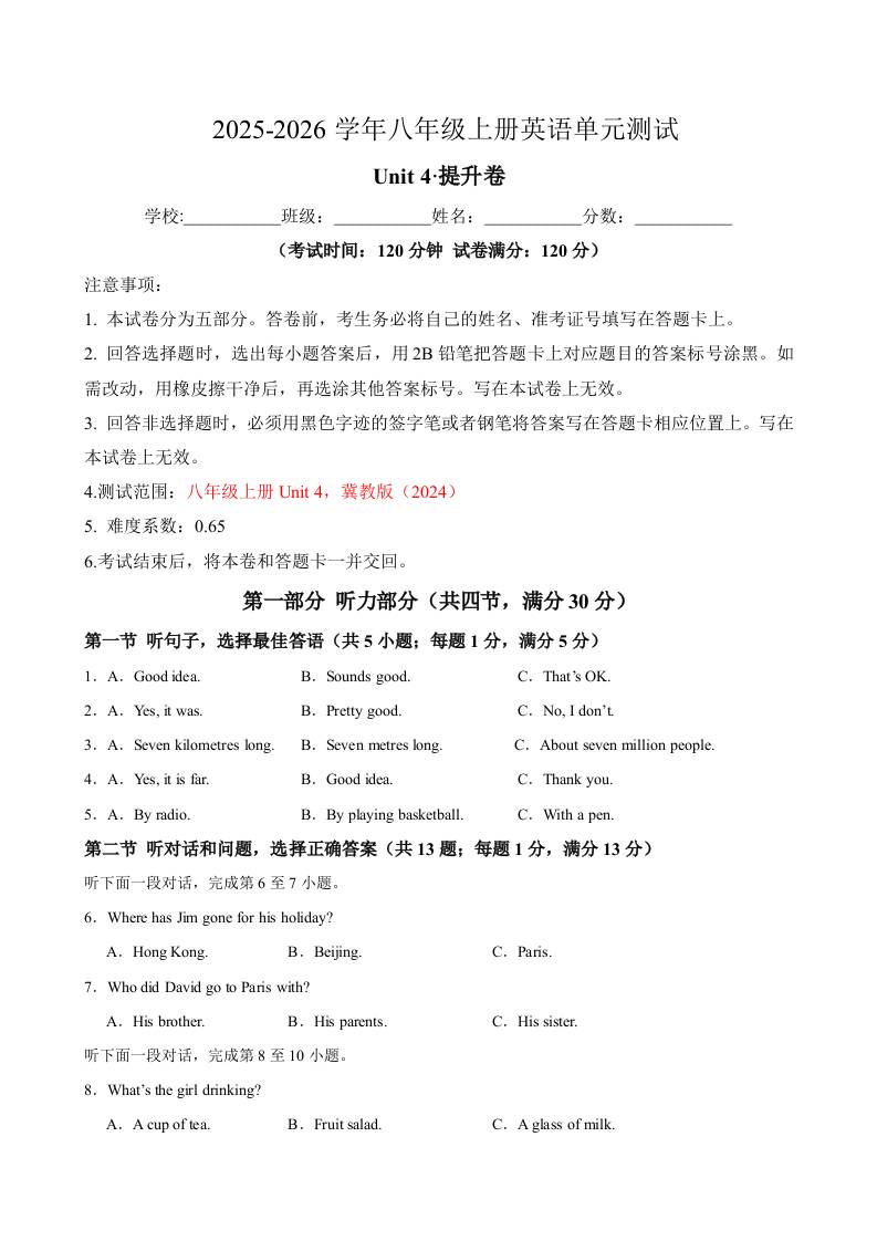 八年级英语上册Unit4单元测试·提升卷(考试版A4)8