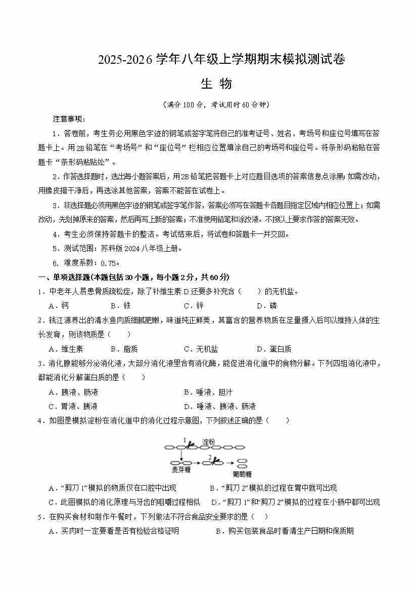 八年级生物上学期期末模拟卷·基础保分卷(新教材苏科版)(考试版A4)