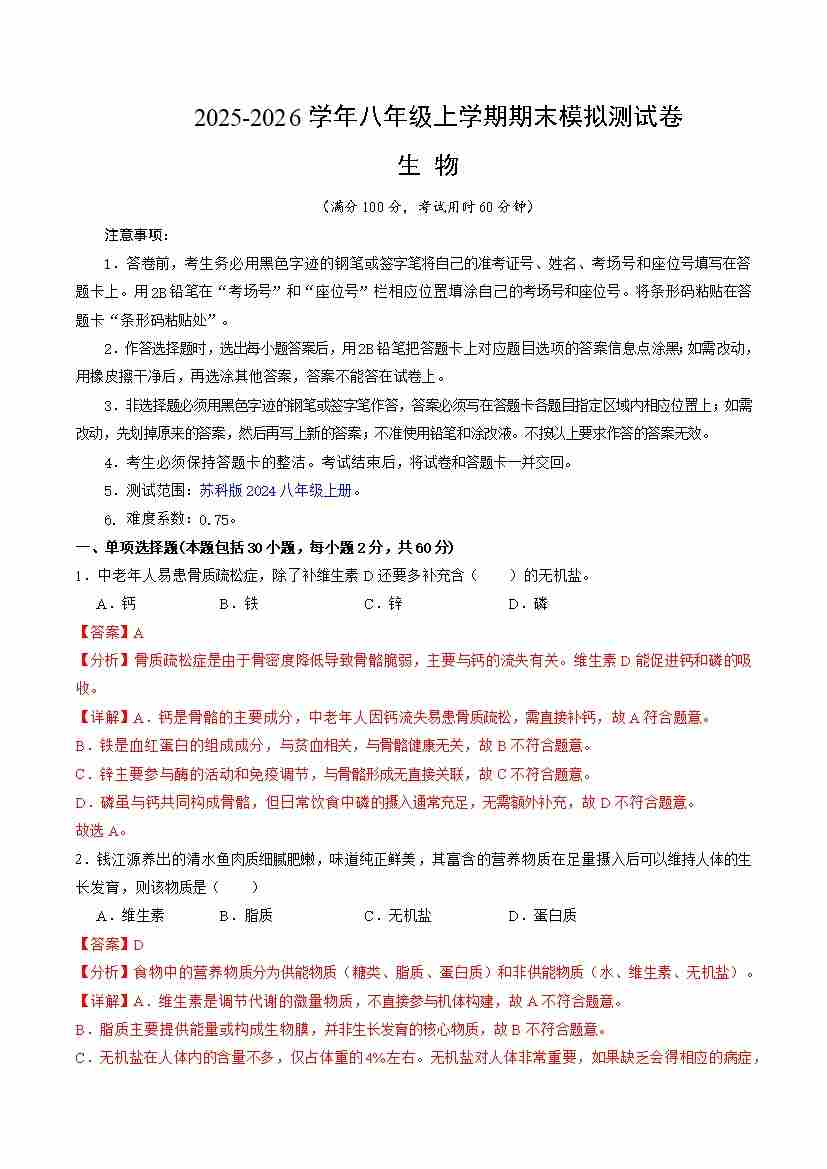 八年级生物上学期期末模拟卷·基础保分卷(新教材苏科版)(全解全析)