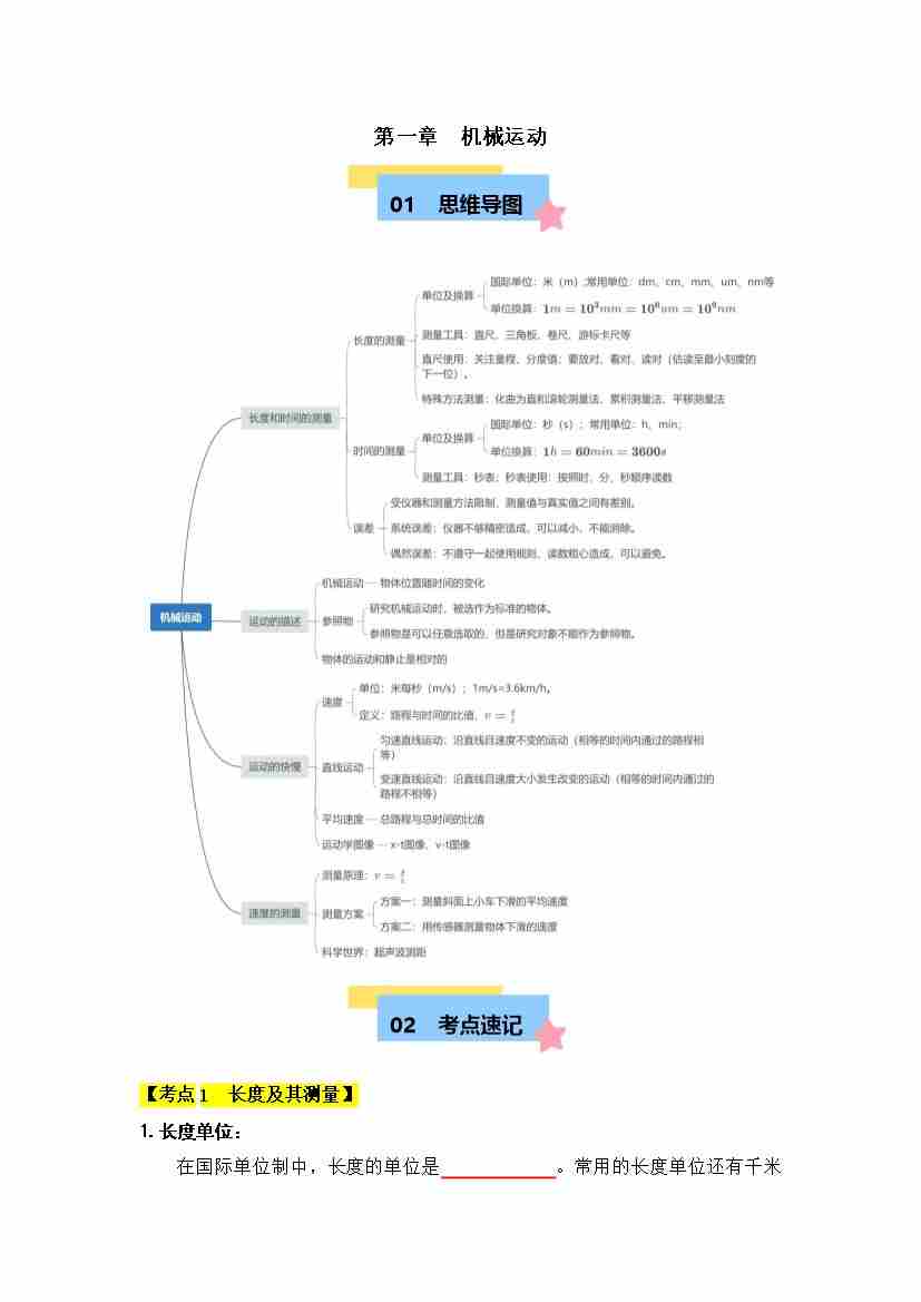 首页 > 全部 > 速记清单 > 第1章 机械运动【速记清单】(原卷版)-八年级物理上册单元速记·巧练(新人教版2024)