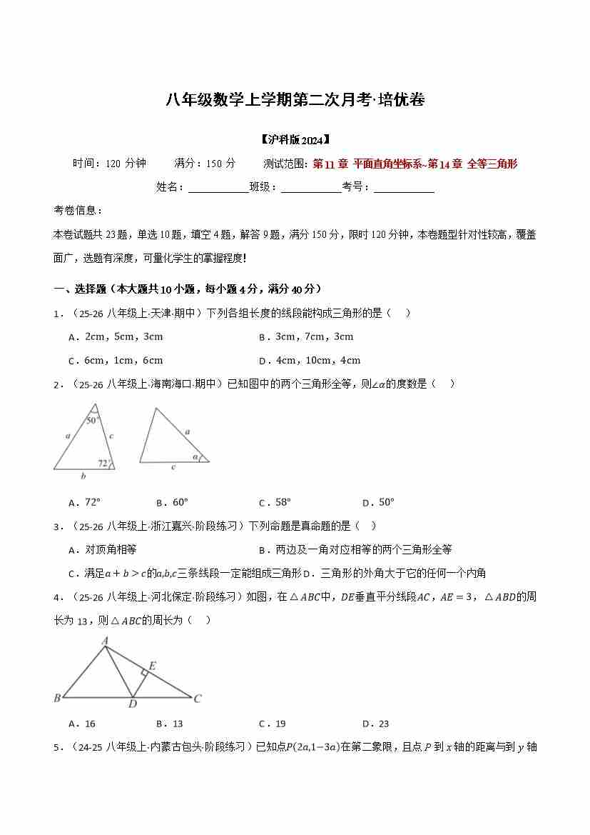 首页 > 全部 > 月考试卷 > 八年级数学上学期第二次月考·培优卷(沪科版2024,举一反三)(学生版)