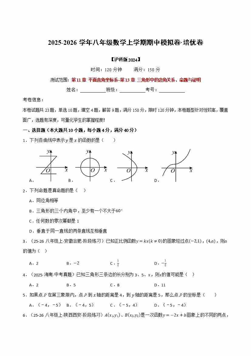 首页 > 全部 > 期中试卷 > 八年级数学上学期期中模拟卷·培优卷(沪科版2024,举一反三)(学生版)