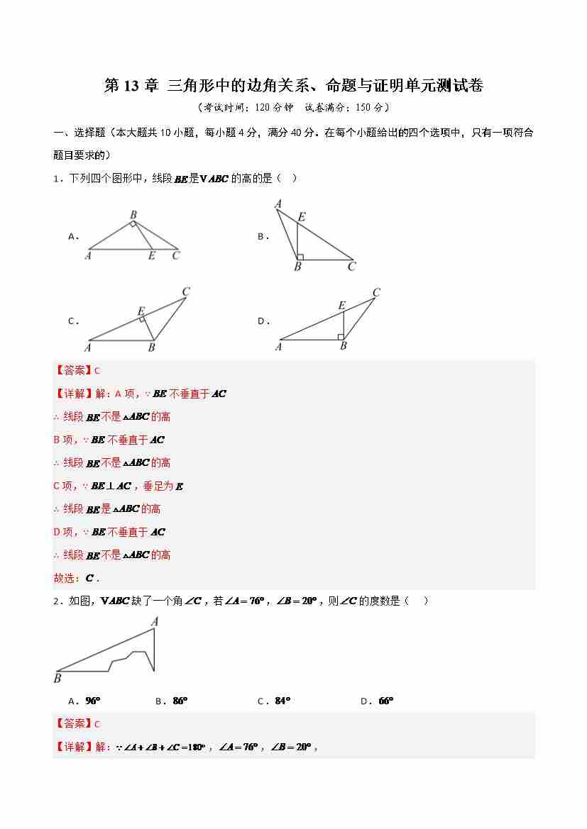 首页 > 全部 > 单元检测 > 第13章 三角形中的边角关系、命题与证明(高效培优单元测试·强化卷)(全解全析)