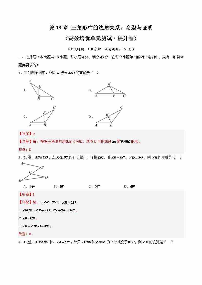 第13章 三角形中的边角关系、命题与证明(高效培优单元测试·提升卷)教师版