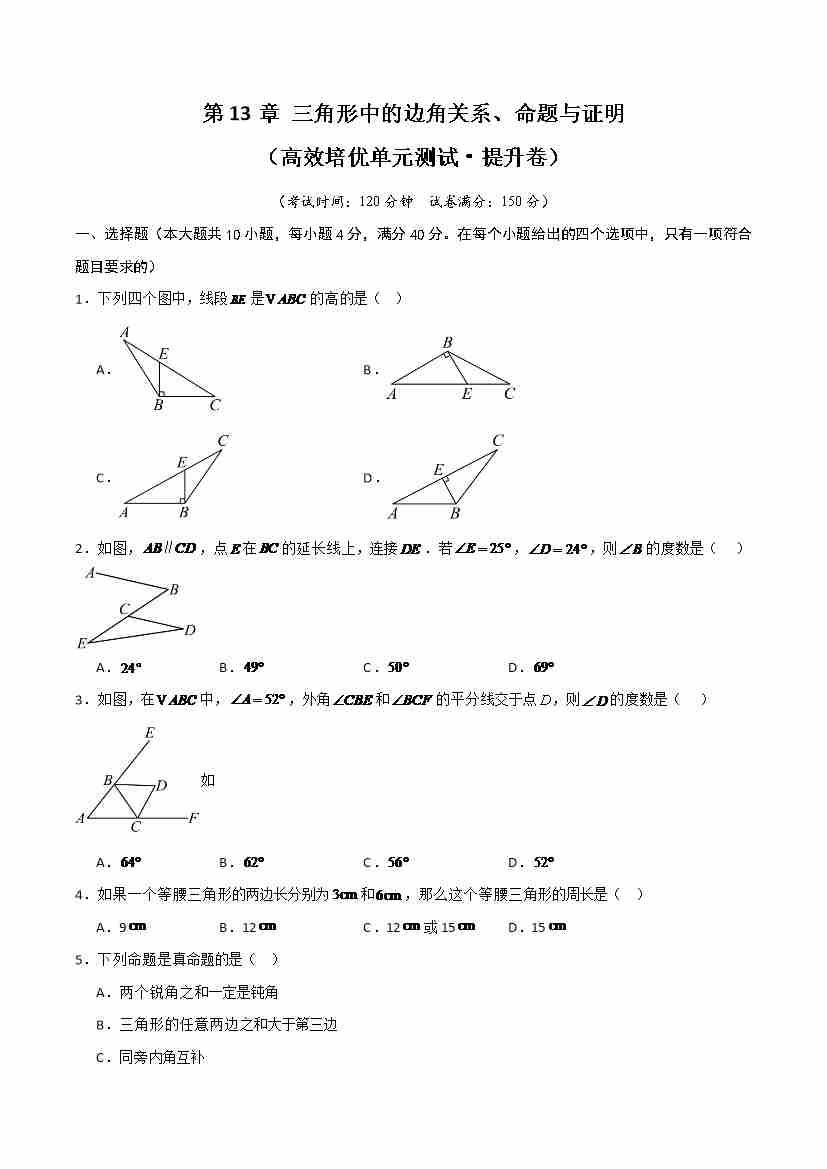 第13章 三角形中的边角关系、命题与证明(高效培优单元测试·提升卷)学生版
