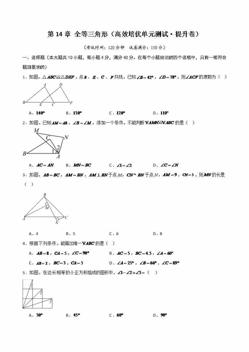 第14章 全等三角形(高效培优单元测试·提升卷)学生版