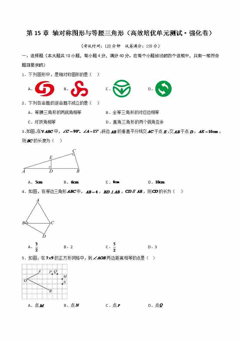 首页 > 全部 > 单元检测 > 第15章 轴对称图形与等腰三角形(高效培优单元测试·强化卷)原卷版