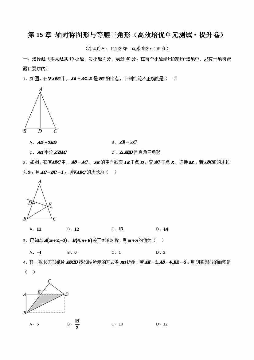 第15章 轴对称图形与等腰三角形(高效培优单元测试·提升卷)原卷版