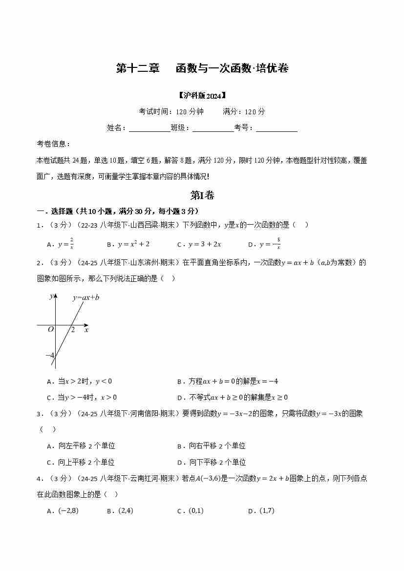 首页 > 全部 > 举一反三 > 第十二章 函数与一次函数(举一反三单元测试·培优卷)(学生版)