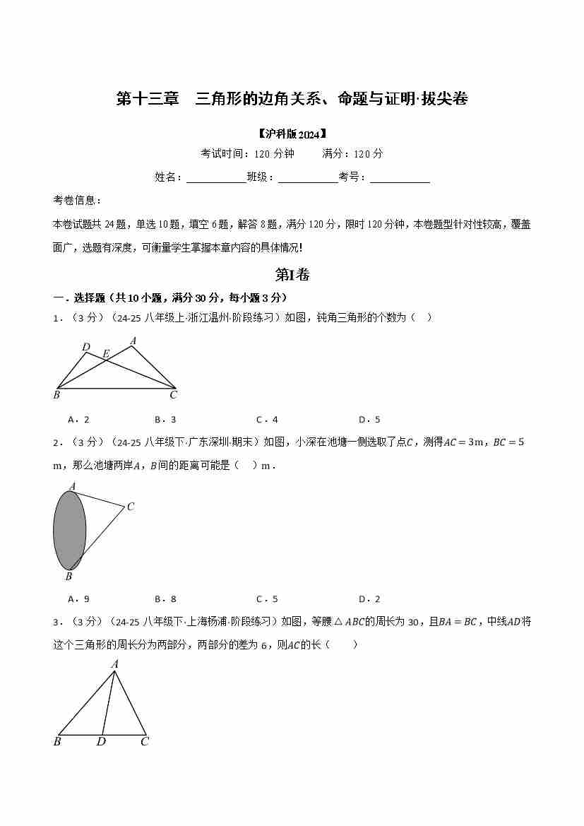 第十三章 三角形的边角关系、命题与证明(举一反三单元测试·拔尖卷)(学生版)