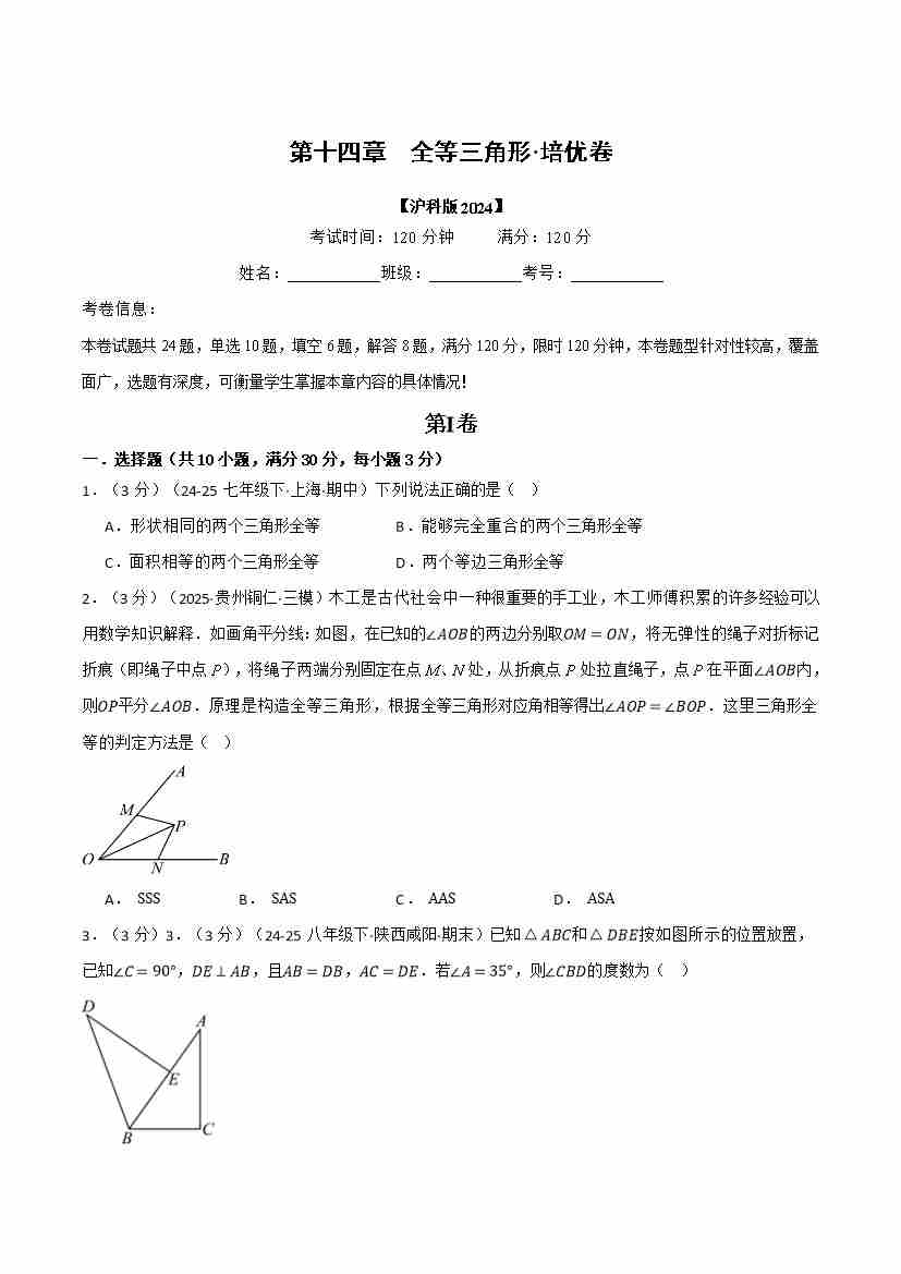 首页 > 全部 > 举一反三 > 第十四章 全等三角形(举一反三单元测试·培优卷)(学生版)