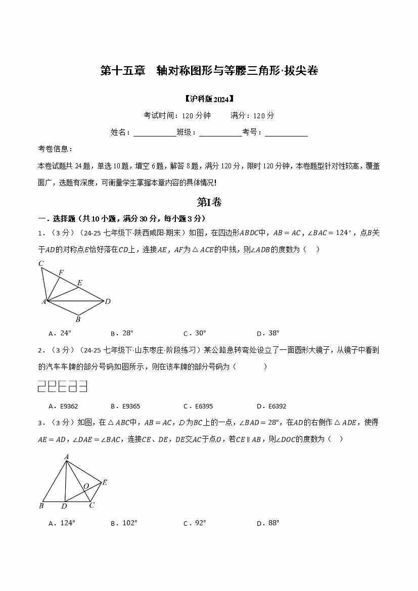 首页 > 全部 > 举一反三 > 第十五章 轴对称图形与等腰三角形(举一反三单元测试·拔尖卷)(原卷版)