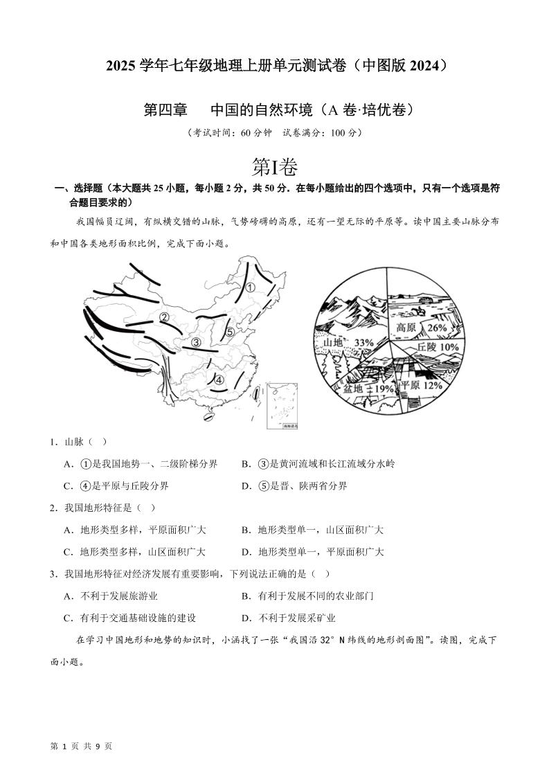 第四章 中国的自然环境【A卷·培优卷】-七年级地理上册单元速记·巧练(中图版)(原卷版)