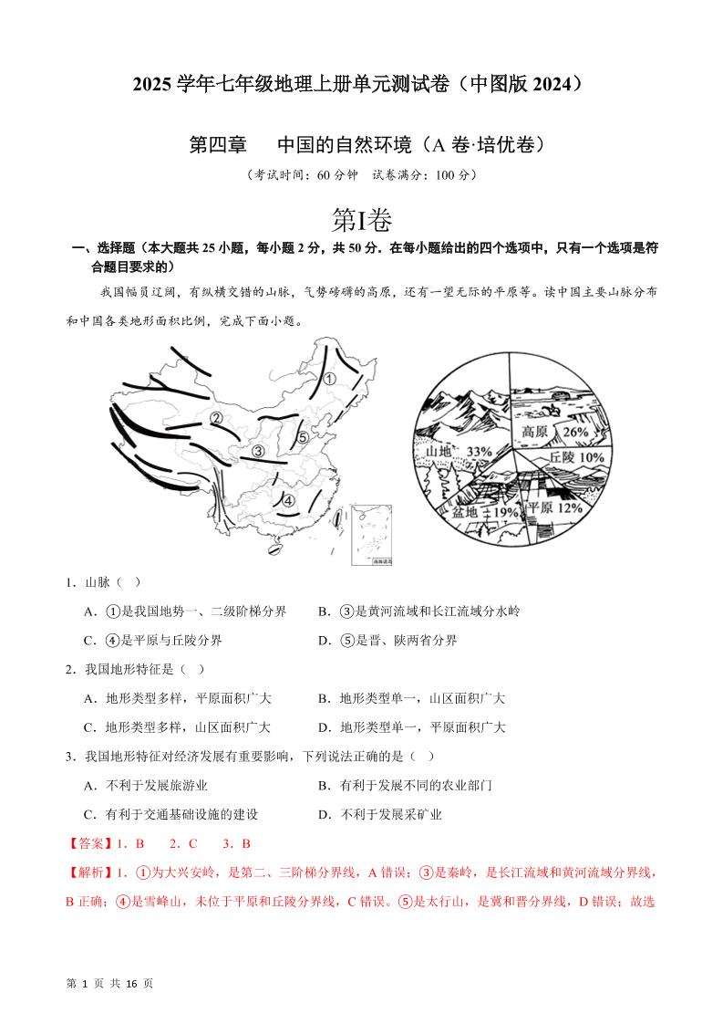 首页 > 全部 > 基础达标卷 > 第四章 中国的自然环境【A卷·培优卷】-七年级地理上册单元速记·巧练(中图版)(解析版)