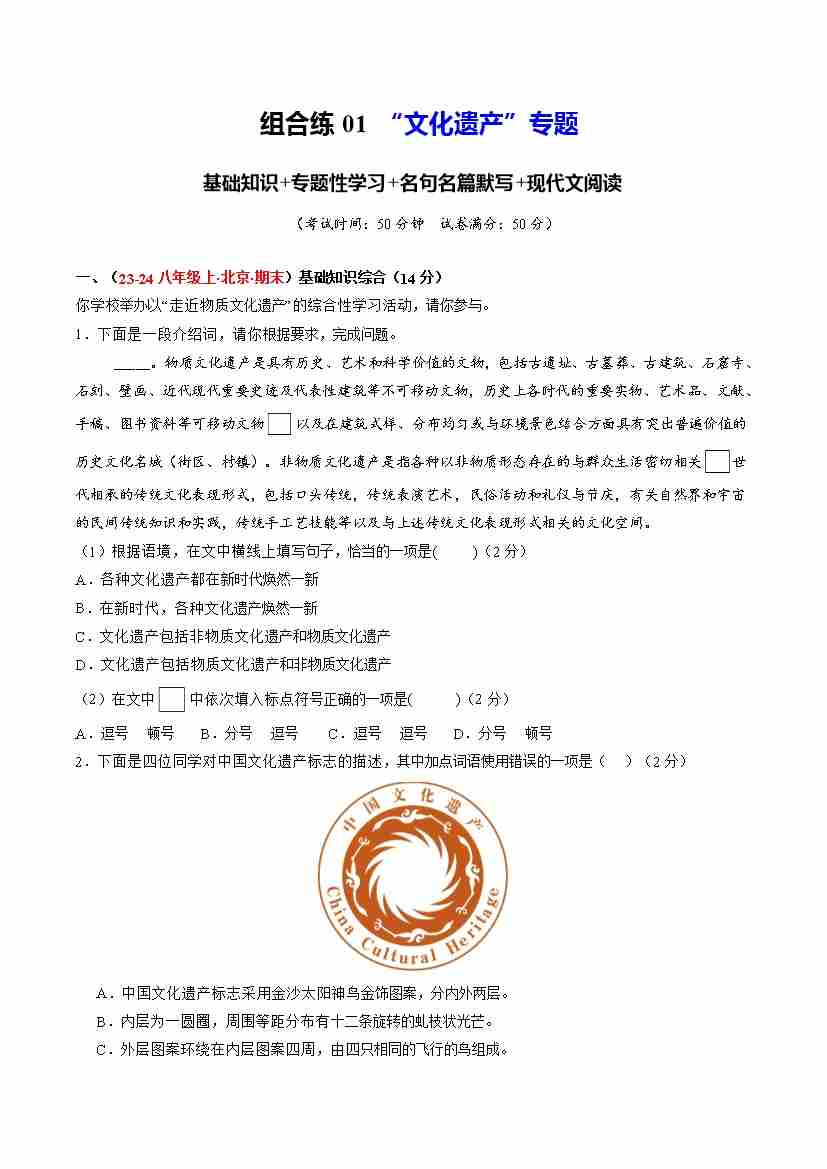 首页 > 全部 > 期末专项2 > 组合练01 “文化遗产”专题(解析版)