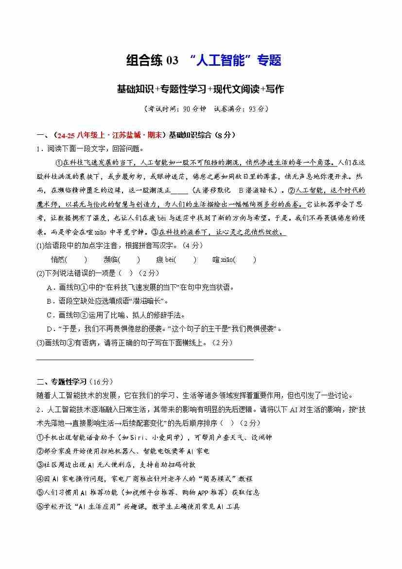 首页 > 全部 > 期末专项2 > 组合练03 “人工智能”专题(原卷版)