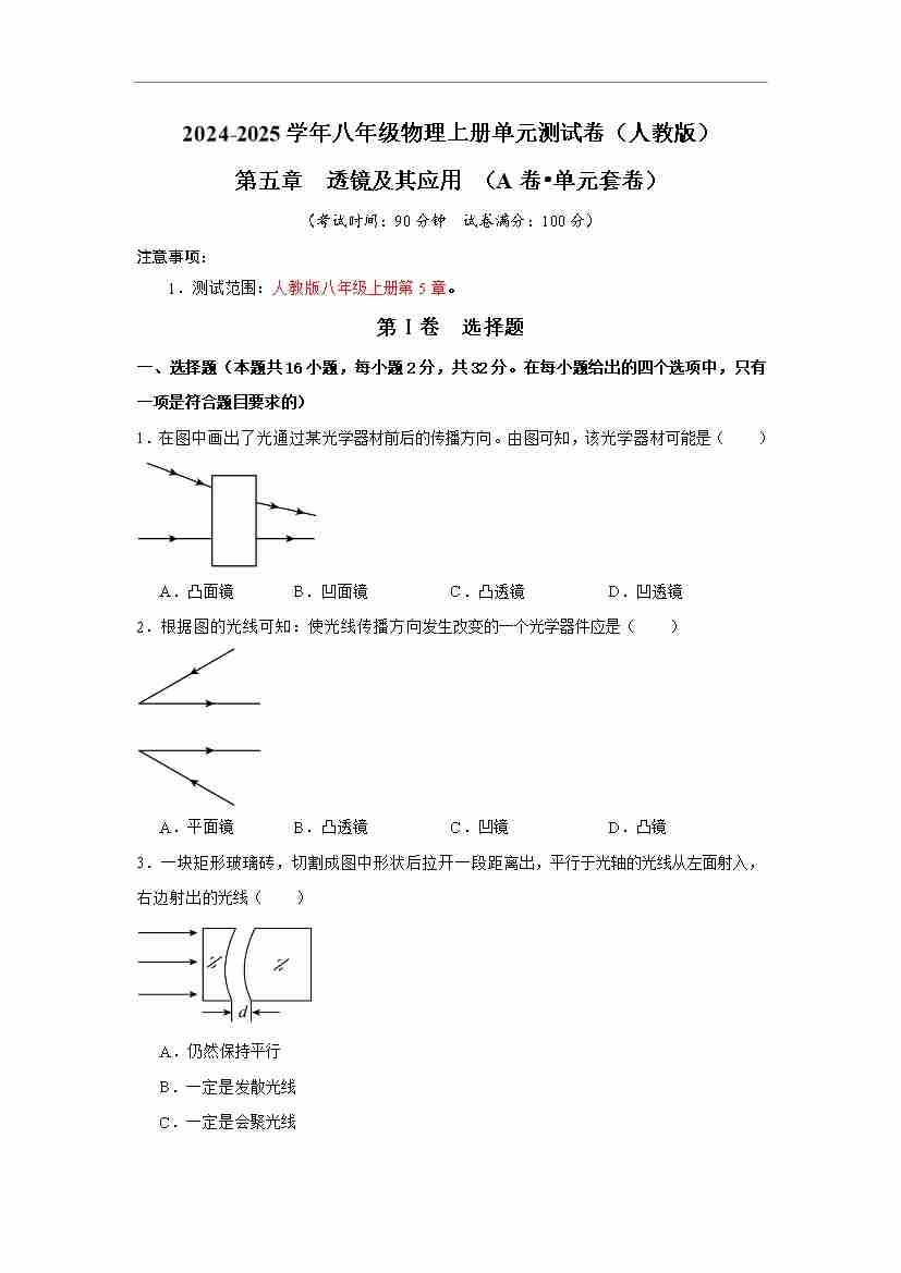 首页 > 全部 > 单元达标卷 > 第5章 透镜及其应用【A卷•单元套卷】(原卷版)