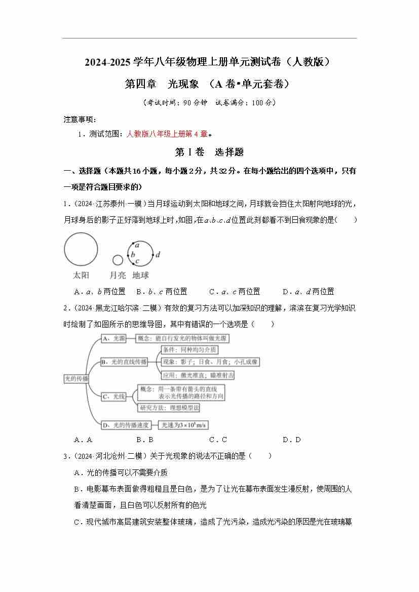 第4章 光现象【A卷•单元套卷】(原卷版)