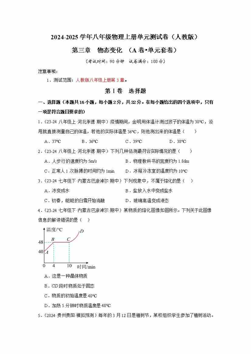 首页 > 全部 > 单元达标卷 > 第3章 物态变化【A卷•单元套卷】(原卷版)