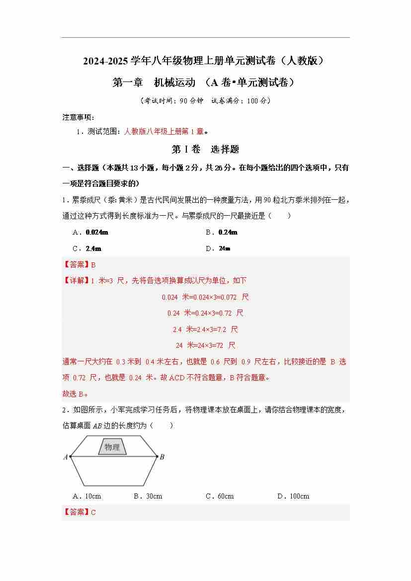 第1章 机械运动【A卷•单元测试卷】(解析版)