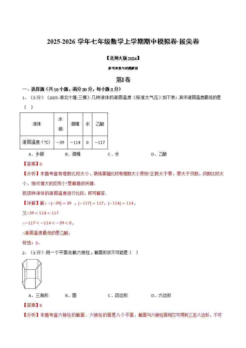 首页 > 全部 > 期中试卷 > 七年级数学上学期期中模拟卷·拔尖卷(北师大版2024,举一反三)(教师版)